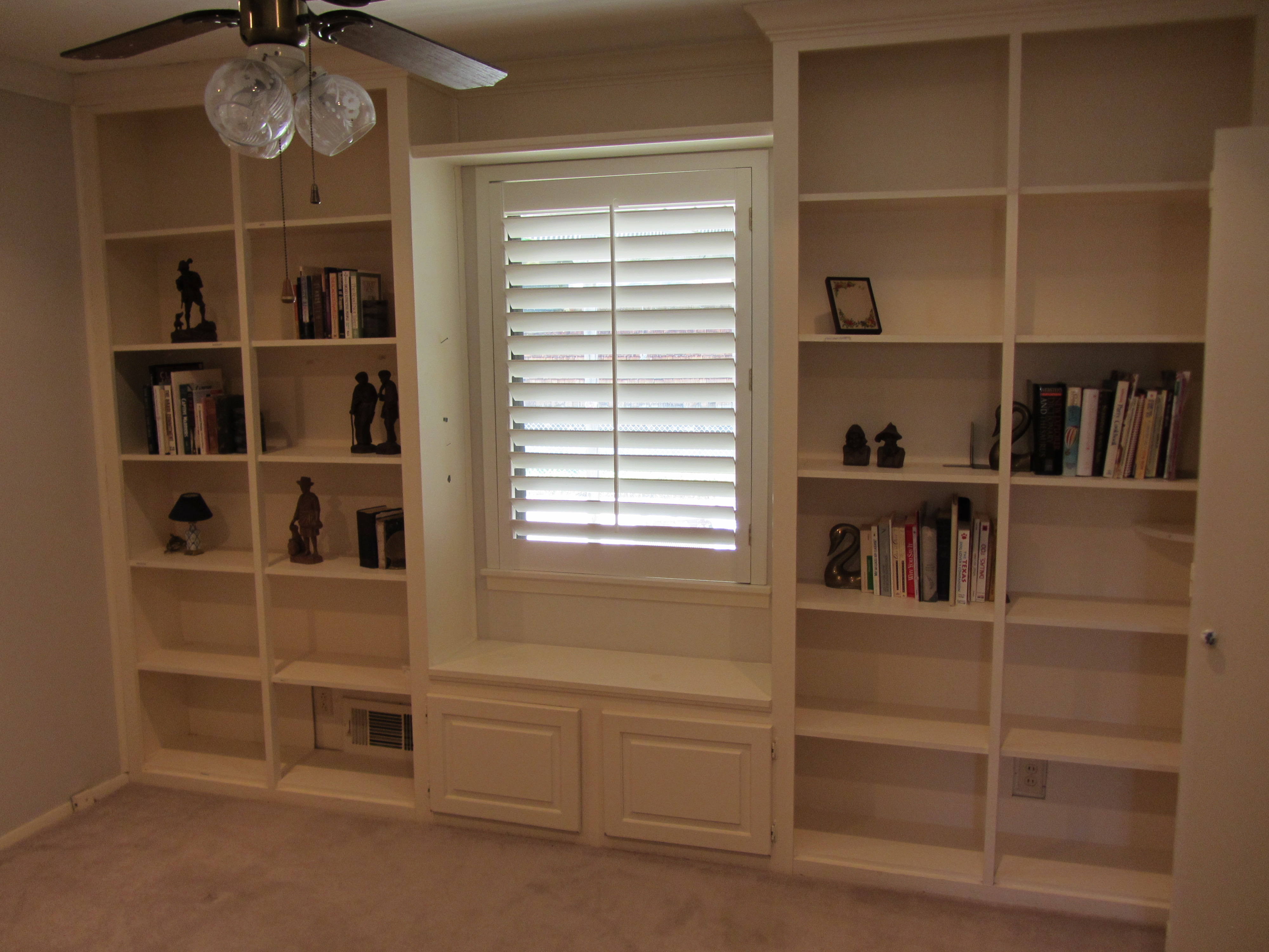 Then I painted the whole thing (two coats and a third to the mantle and hearth) with Benjamin Moore white linen (color matched to Lowe’s Olympic no-voc semi-gloss paint). Because my Benjamin Moore store wasn’t open on Labor Day… and that whole, I want it now attitude. You get the idea.