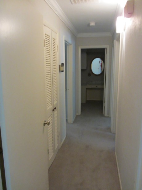 Laundry closet – Benjamin Moore marblehead gold HC-11 – Does anything look good with open-faced/cobbled cabinets and a fire extinguisher?? Really?